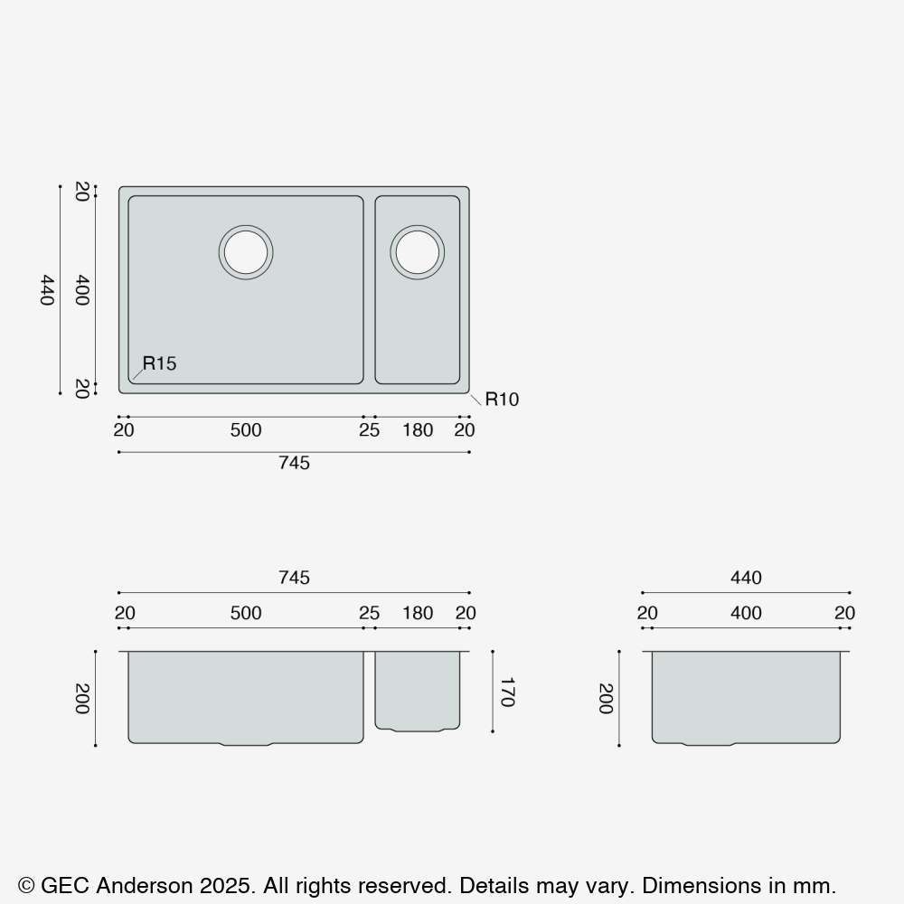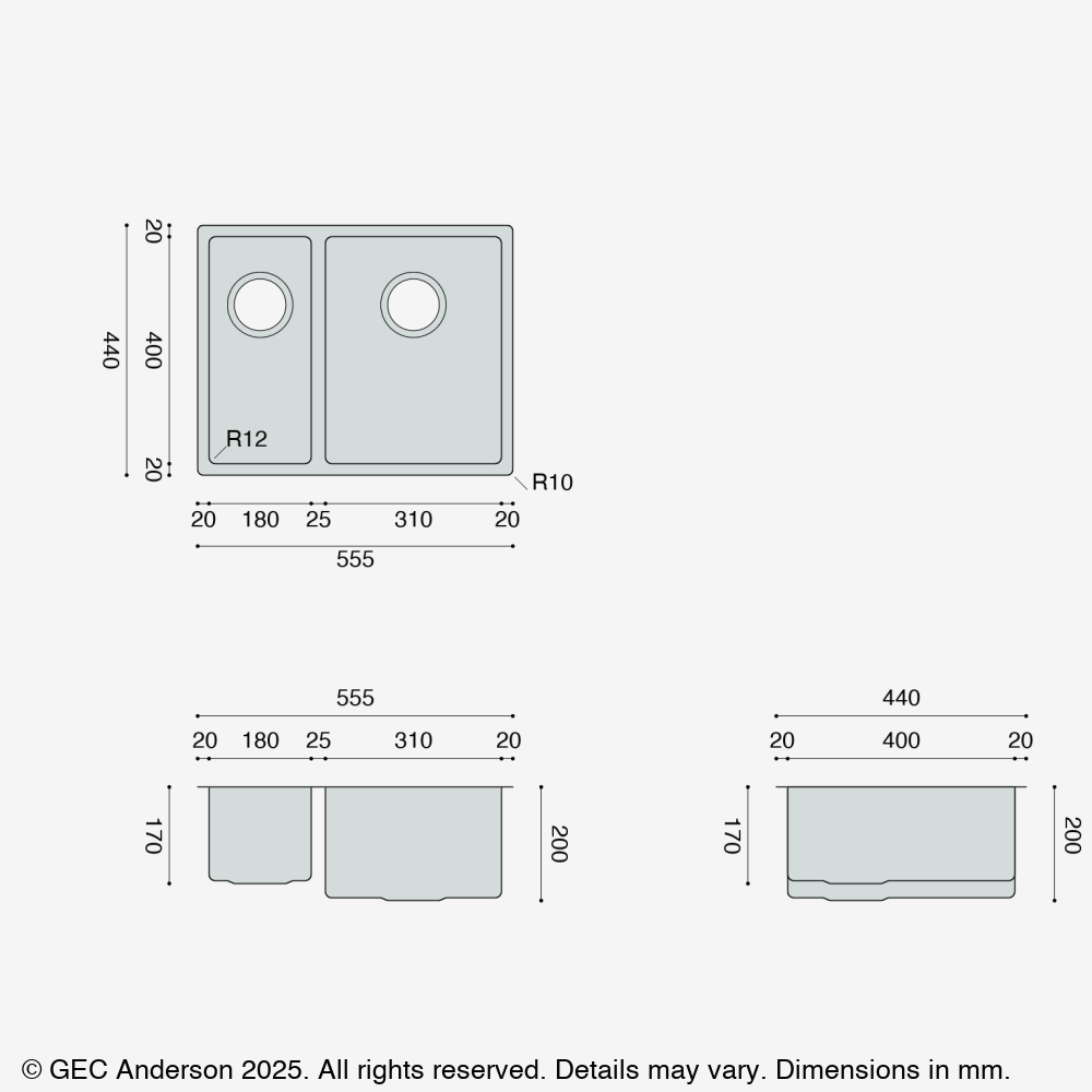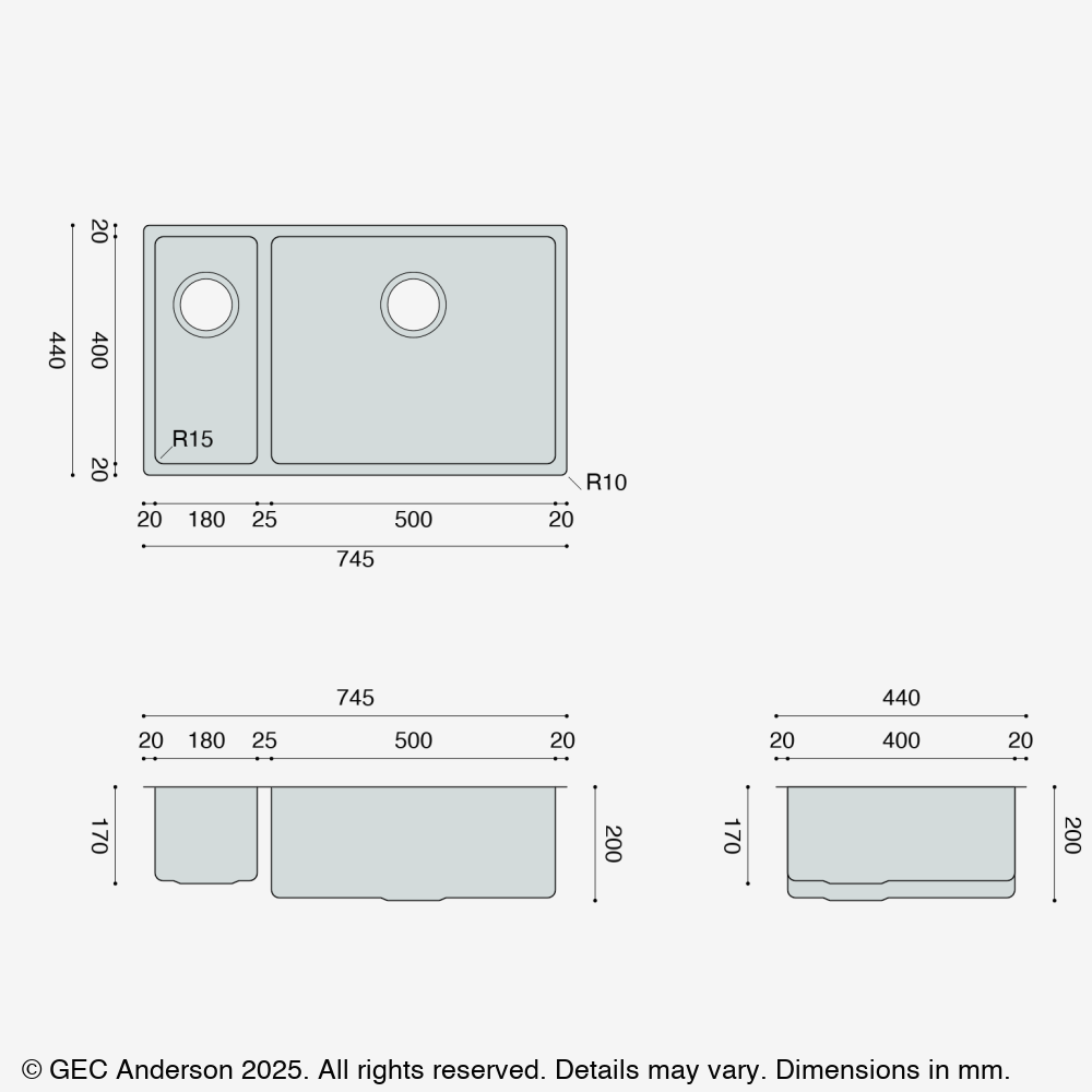 • Internal bowl size: 180 x 400 x 170 mm with 15 mm corner radius