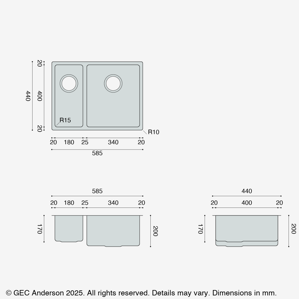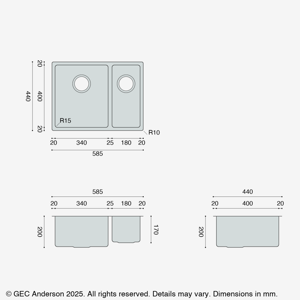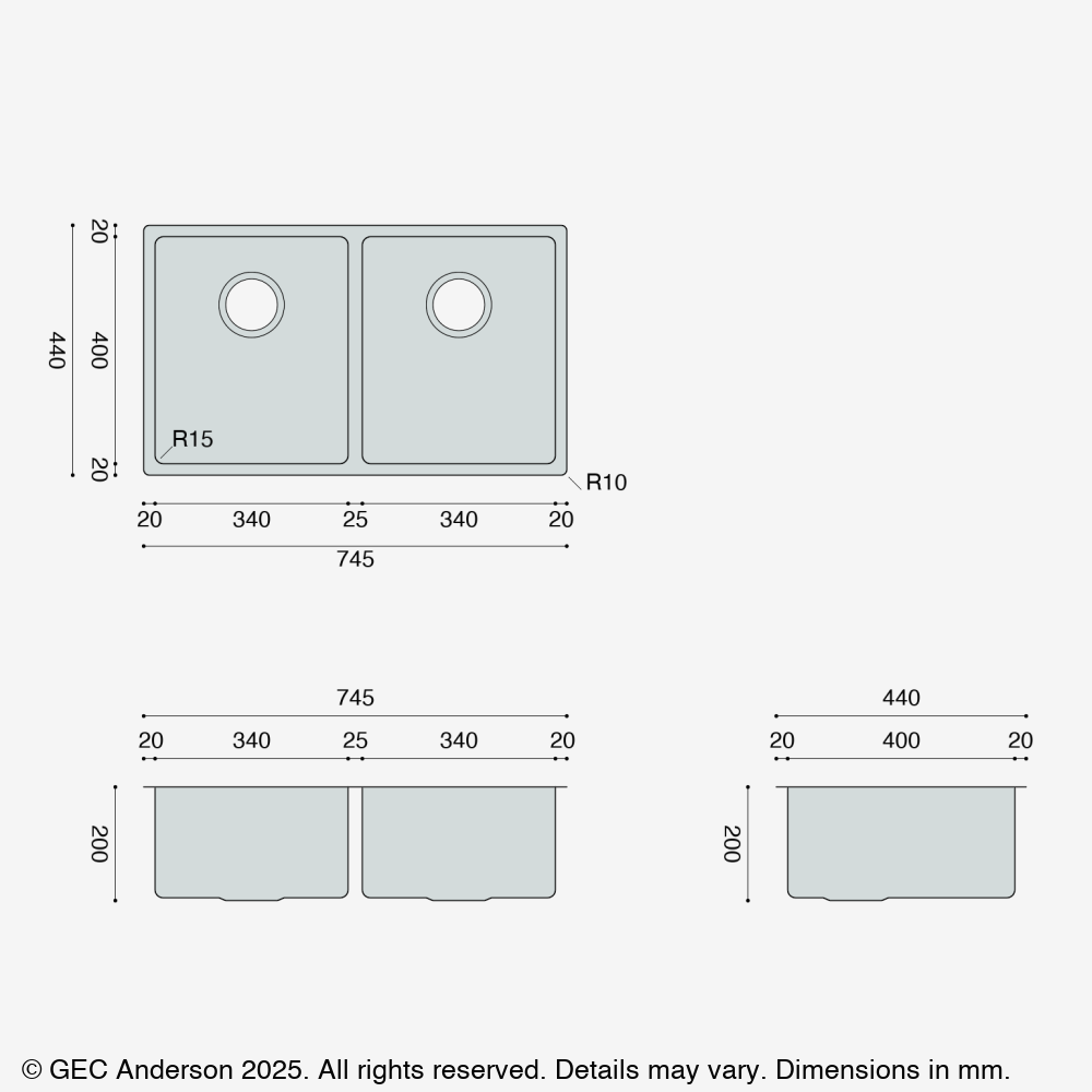 • Internal bowl size: 340x400x200mm with 15mm corner radius