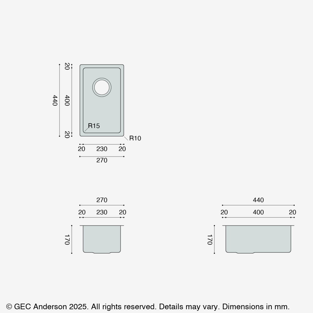 • Internal bowl size: 230x400x170mm with 15mm corner radius