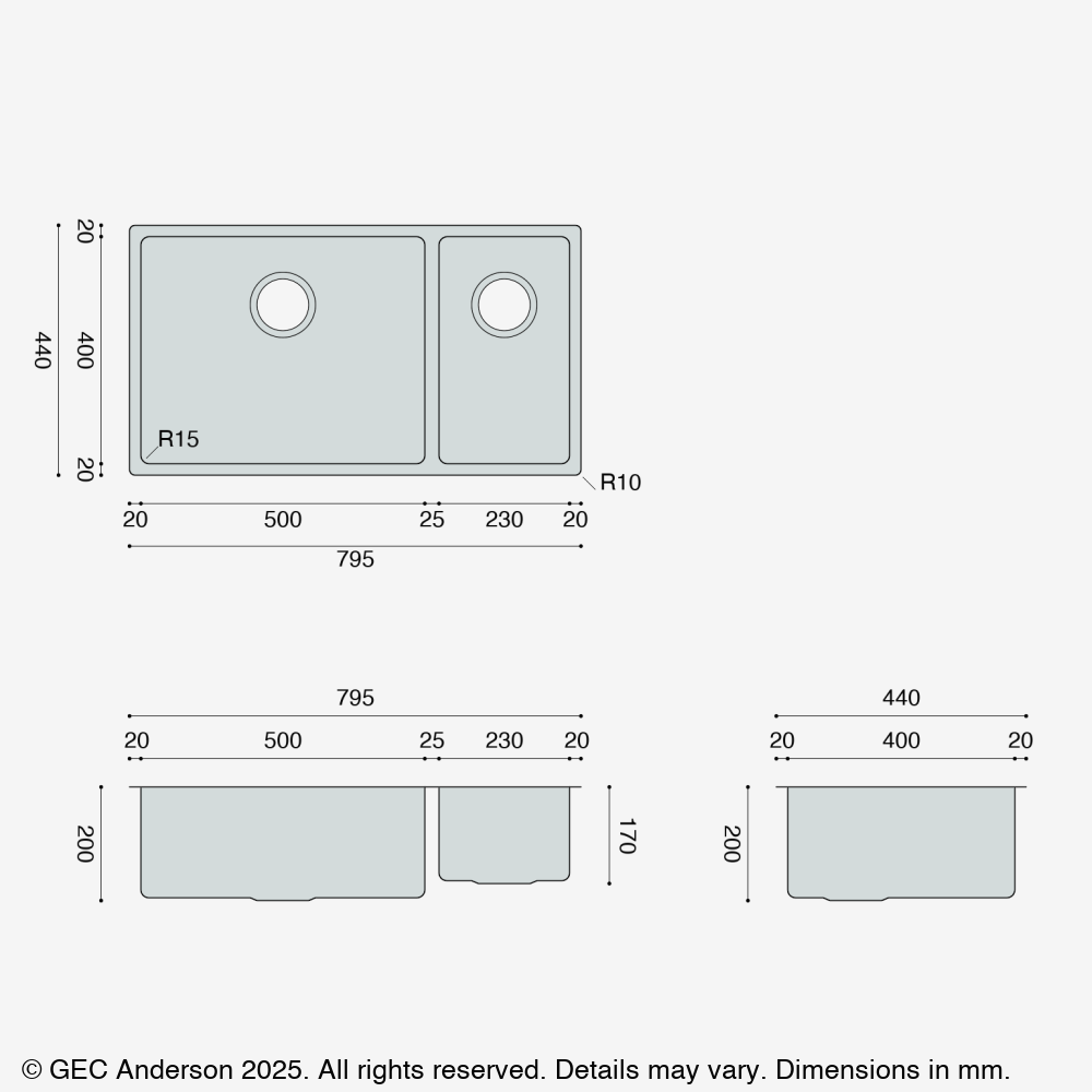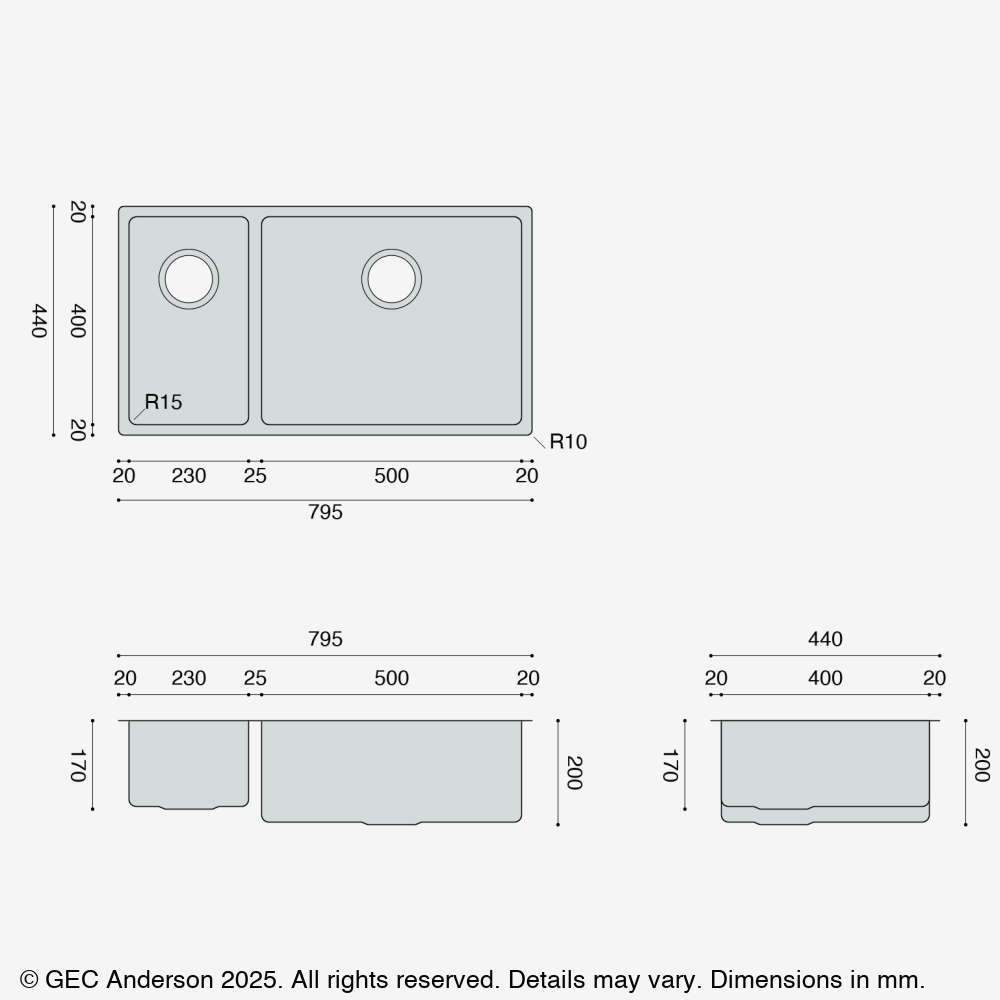 • Internal bowl size: 230 x 400 x 170 mm with 15 mm corner radius