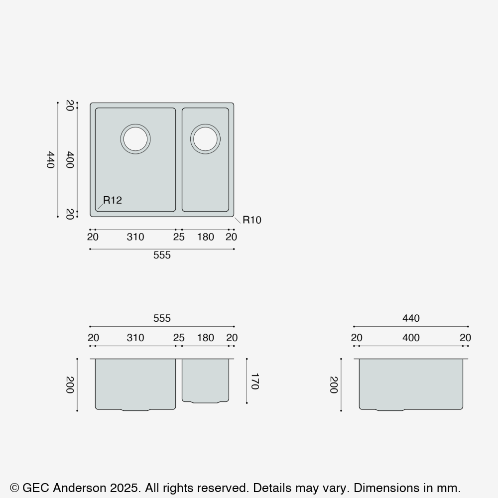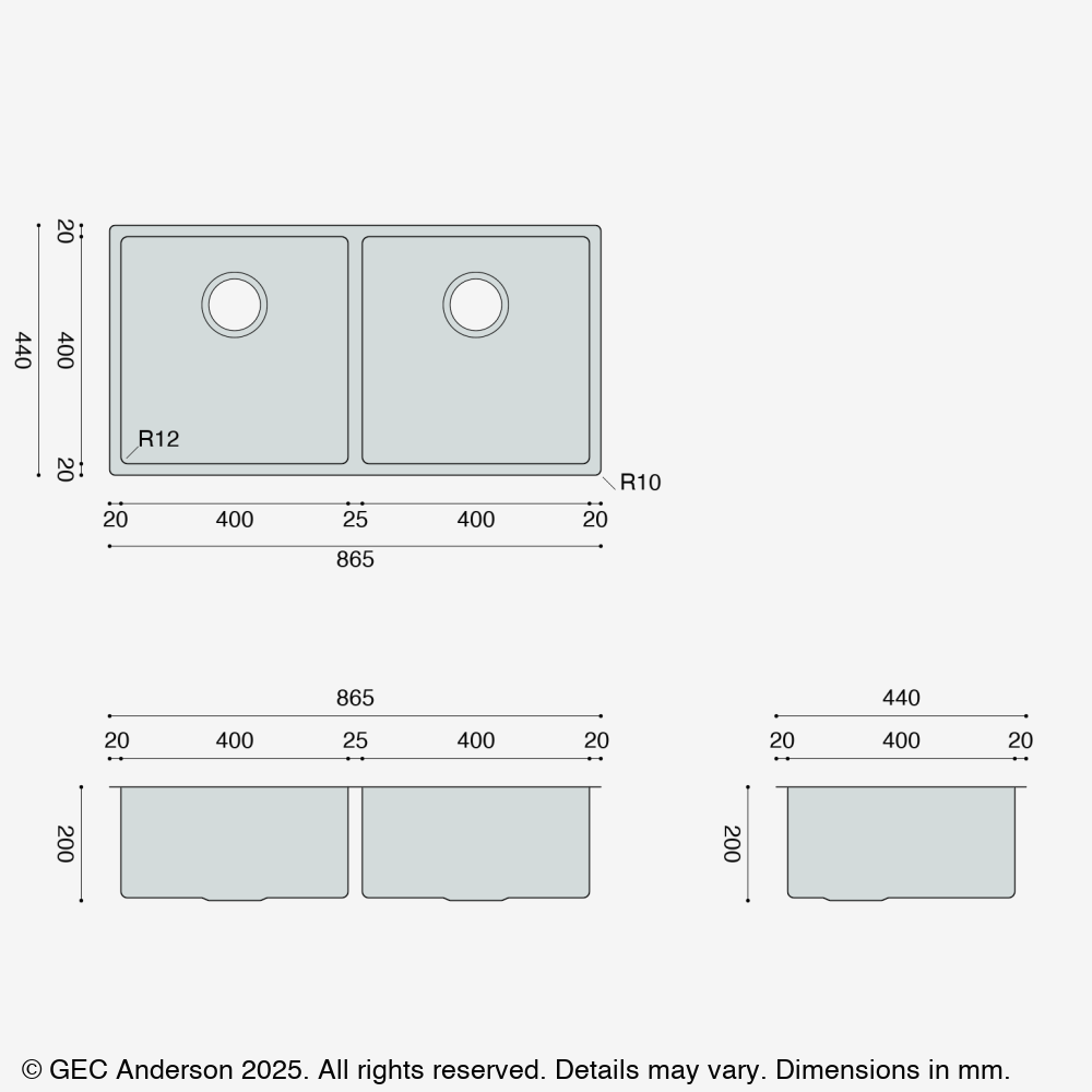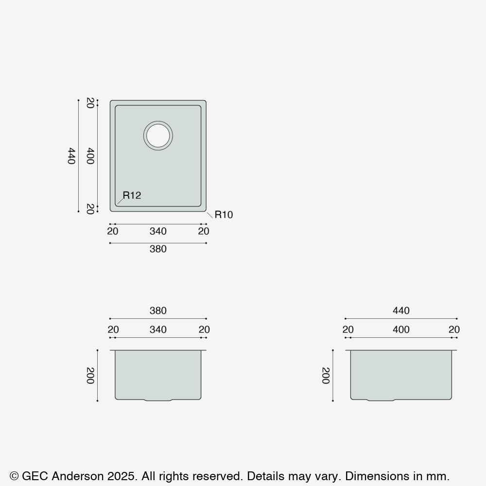 • Internal bowl size: 340x400x200mm with 12mm corner radius