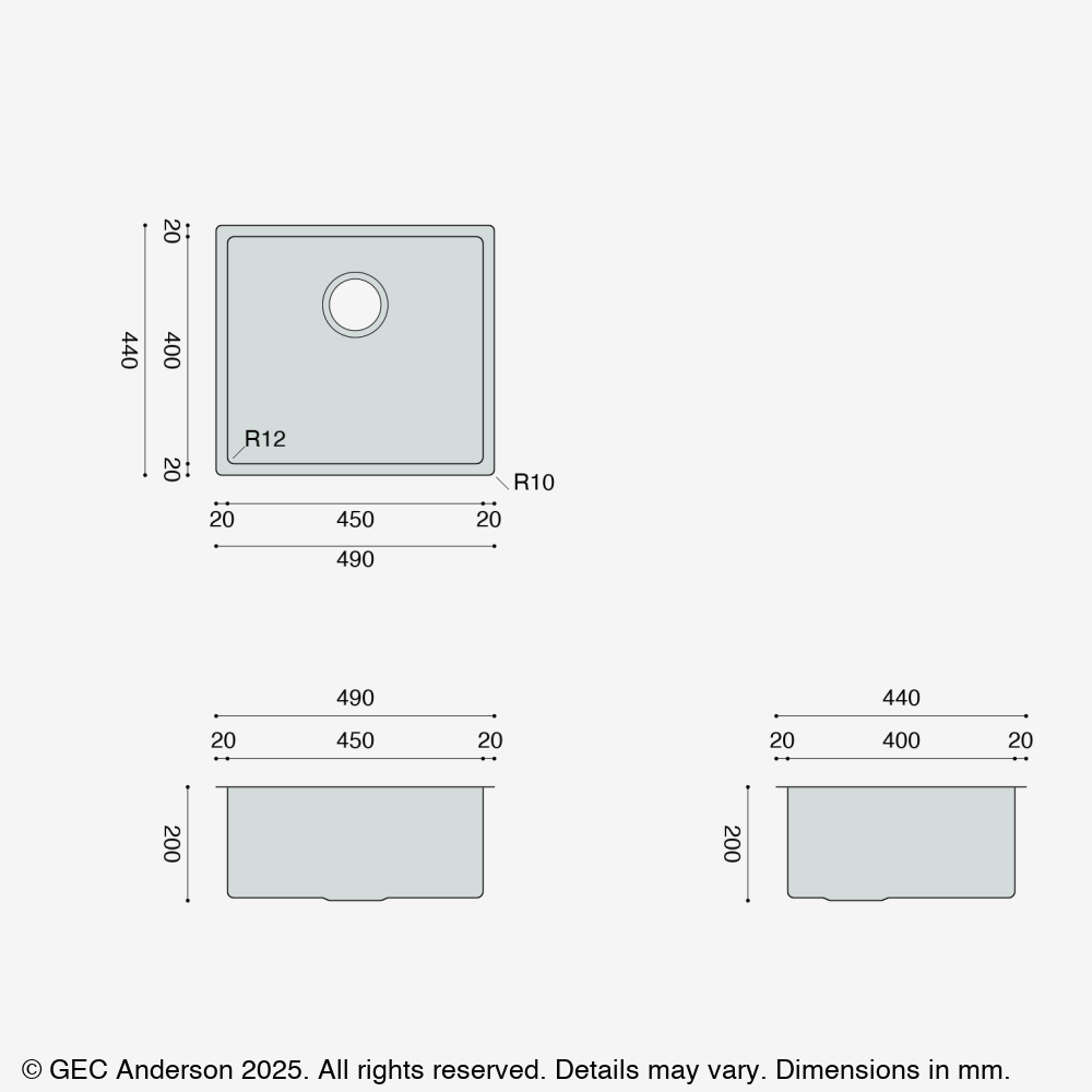 • Internal bowl size: 400x400x200mm with 12mm corner radius
